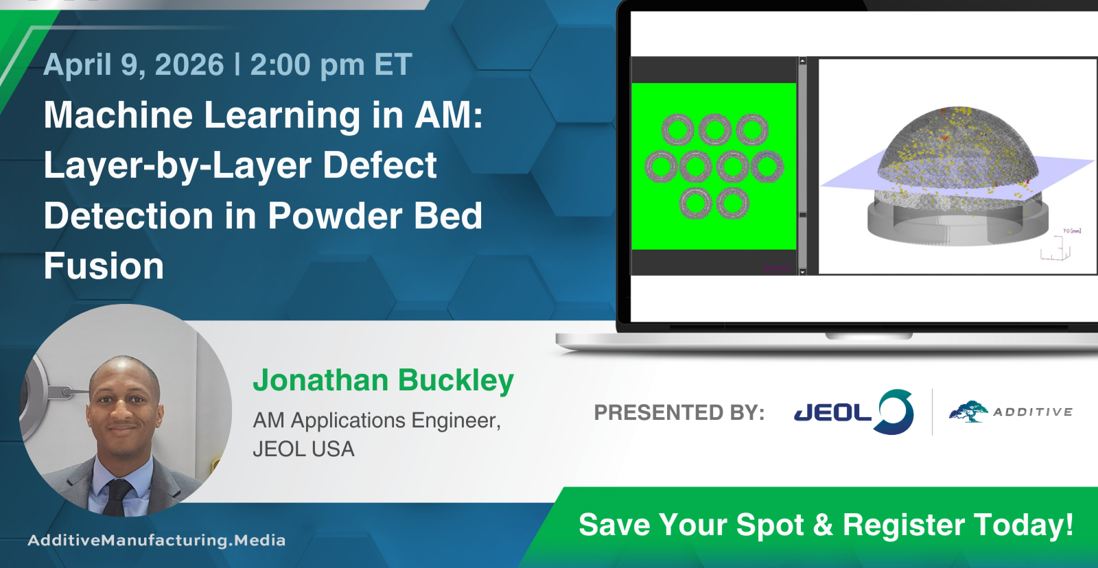 Jonathan Buckley is an AM applications engineer for JEOL USA, supporting JEOL's additive manufacturing division. He has worked in the additive manufacturing industry for the past 10 years, primarily supporting electron beam powder bed fusion technologies. Buckley has experience both from supporting an EB-PBF machine manufacturer and from utilizing EB-PBF technology at an AM contract manufacturer focused on the production of additively manufactured orthopedic implants. He actively engages with the AM community through technical outreach including webinars, trade shows and industry events to educate peers on the advantages and applications of EB-PBF.